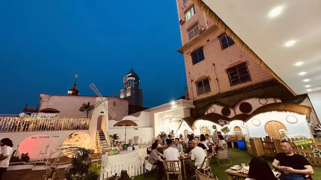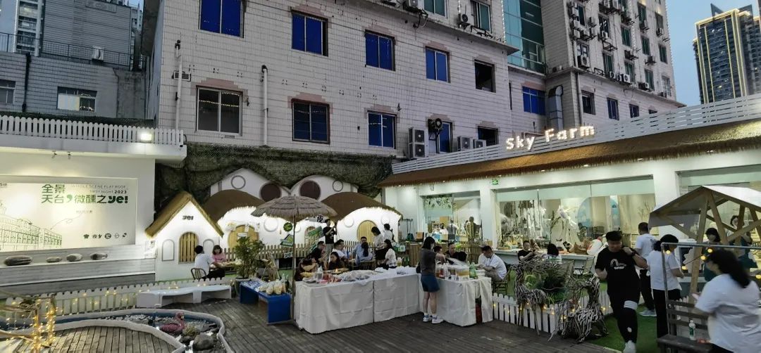 在这里,有一场音乐和语言的交流,可以认识新的朋友,了解有趣的故事,在夜以继日里提供温情对话平台;在这里,品茶和撸串完美融合,一边看着露天电影,一边欣赏城市夜景,放下日常压力,享受当下惬意;在这里,可以探索自然的想象,一个露营椅,宠物在脚边依偎,美酒在手中轻晃,美好的故事也自然发生;在这里,与朋友们相伴而坐,看一片景、听一首歌,一起微笑拍照,就是最美的瞬间。